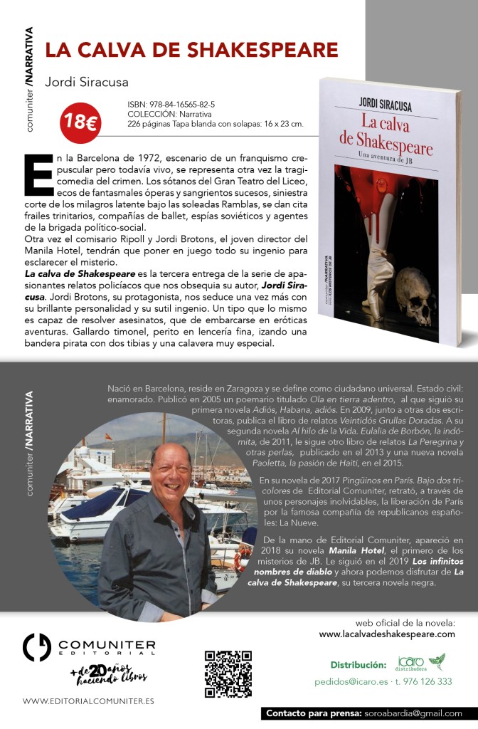 La calva de Shakespeare, saldrá al fin a la venta a primeros de octubre. Este ha sido un año en blanco por la crisis sanitaria, pero nada detiene a la fantasía ni a una lectora o a un lector entusiasmados. Pedidla a vuestra librería de confianza, pero si preferís recibirla en casa sin costes de envío podéis hacerlo en la página de la Editorial Comuniter: