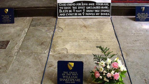 ÚNICO MANUSCRITO DE PUÑO Y LETRA DE SHAKESPEARE. Parte de la obra “Sir Thomas More”, Biblioteca Británica, LondresIglesia de la Santisima Trinidad de Stratford-upon-Avon, donde está enterrado Shakespeare DetalleInterior de la Iglesia Tumba de Shakespeare, con la advertencia escrita en ellaLa advertencia sobre la losa