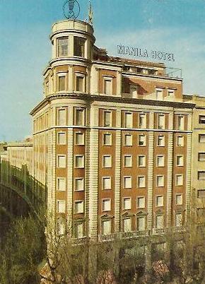 El hotel en la actualidad, la vista es desde el antiguo restaurante del hotel La Parrilla, hoy reconvertido en suite. (Fotos publicitarias de Le Meridien) Cartel publicitario de la La ParrillaPágina publicitaria de la inauguración del Hotel Manila en los años 50El autor trabajando – pese a su postura – en su despacho del Manila Hotel